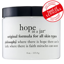 For years, I have used the same Clinique “dramatically different moisturizing lotion,” a staple product in my entire household that even my younger brother started using, to freshin’ up his already uber-soft face. (I hope he isn’t reading this.) I have combination skin– more dry than oily, some days a mess, but most days just normal with a few occasional stubborn breakouts. After years of using the same familiar yellow lotion, I decided to try Philosophy’s “Hope in a Jar,” a top selling cream that is acclaimed to be.. well.. hope in a jar.